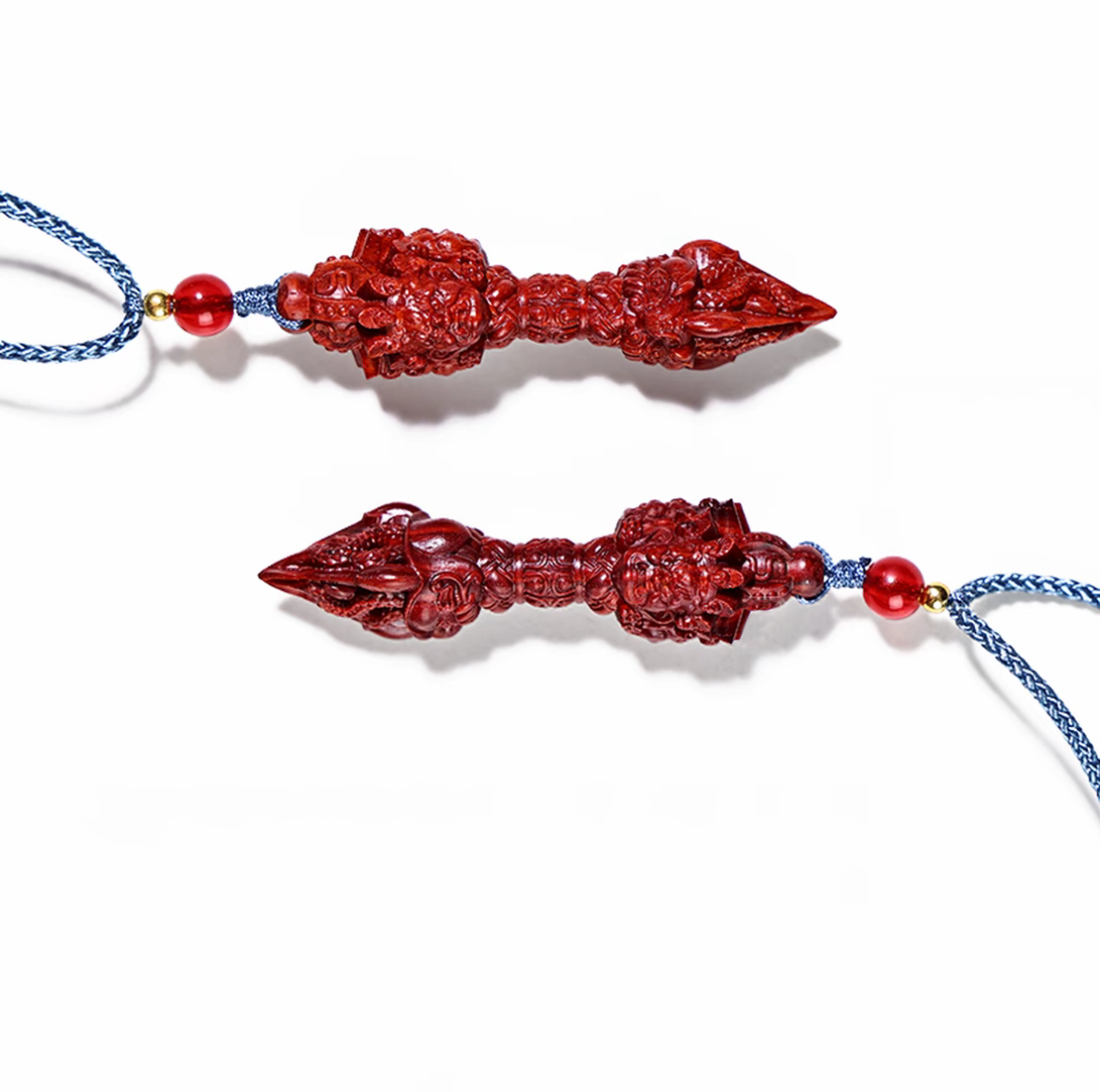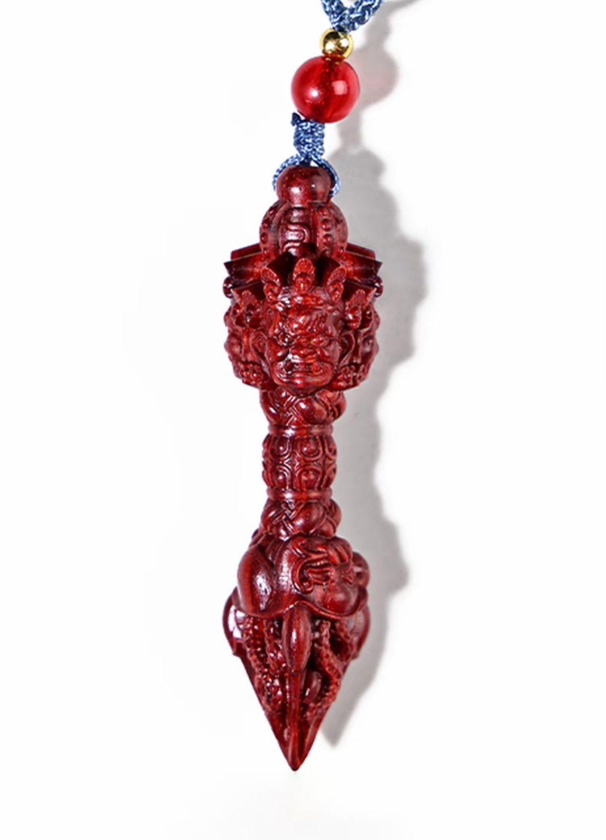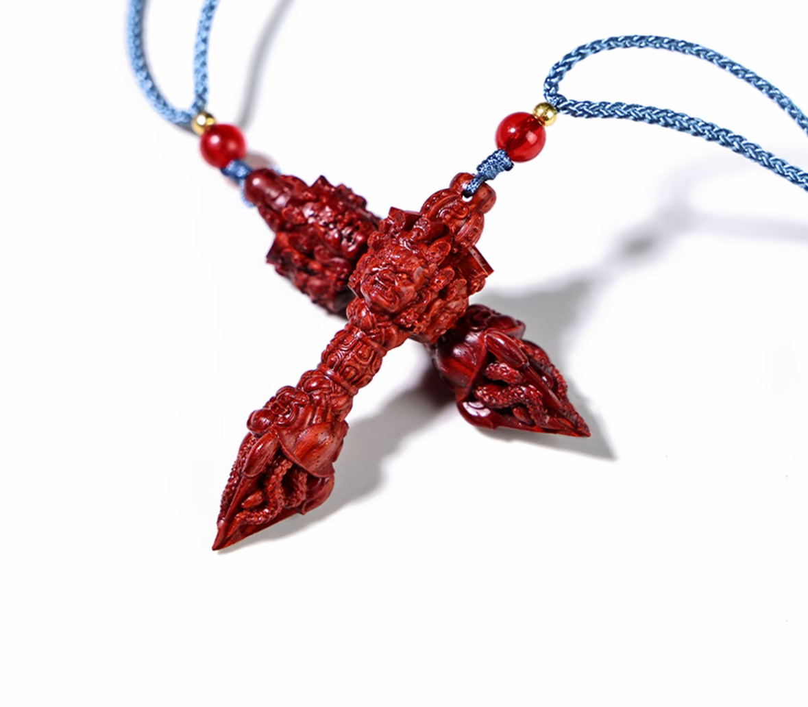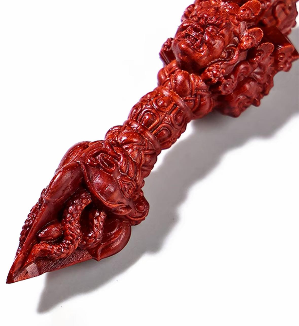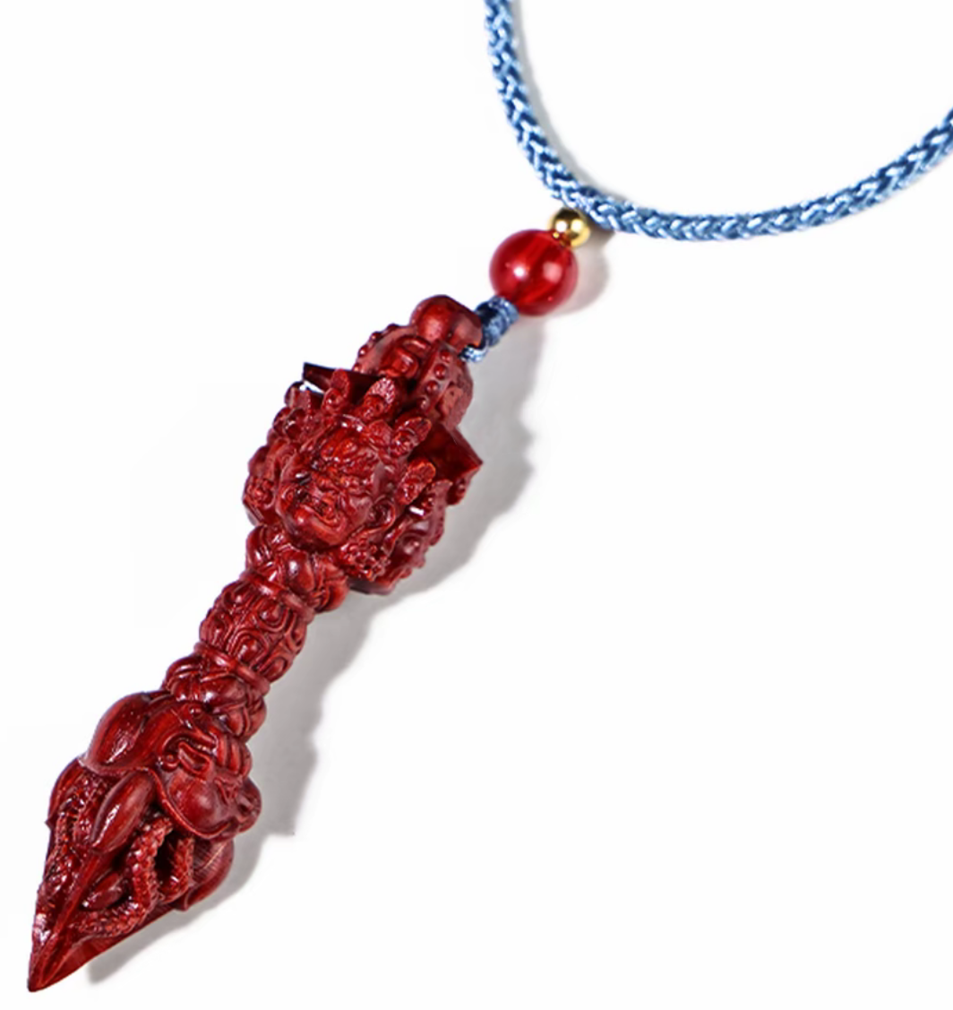 小葉紫檀を原料とした伝統的な金剛杵で、手工芸で精緻に雕刻されています。木材を切り開くと天然の血赤色が発現し、時間を経て酸化されると深い紅色へと変化し、把玩を重ねるほどガラスのような透明感の艶が放たれます。密度が高く重量感があり、握り心地に優れます。金剛杵は仏教文化の象徴で、吉祥・除魔の意味合いを持ち、日常の把玩、置物、お守りとして最適な逸品です。